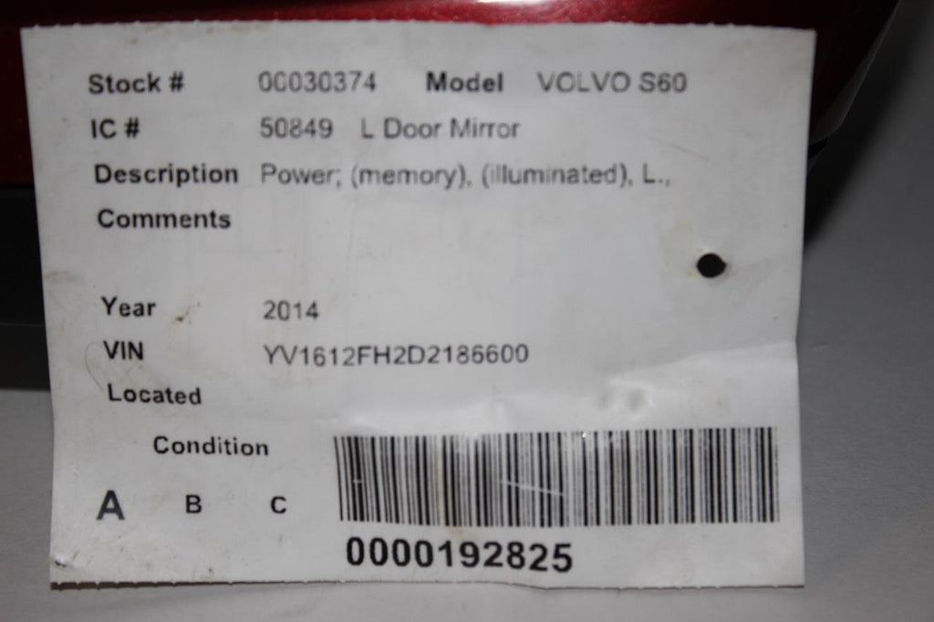 2011-2015 VOLVO S60 SERIES DRIVER LEFT SIDE POWER W/ CAMERA DOOR MIRROR RED